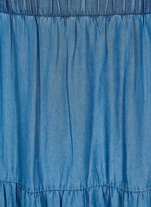 Maxi skirt with a denim look in a light and soft fabric. The skirt features an elastic waistband and is designed with delicate tiered layers that create a feminine A-line silhouette. This skirt contains 100% TENCEL™ Lyocell fibers, which are naturally soft and smooth to the touch.