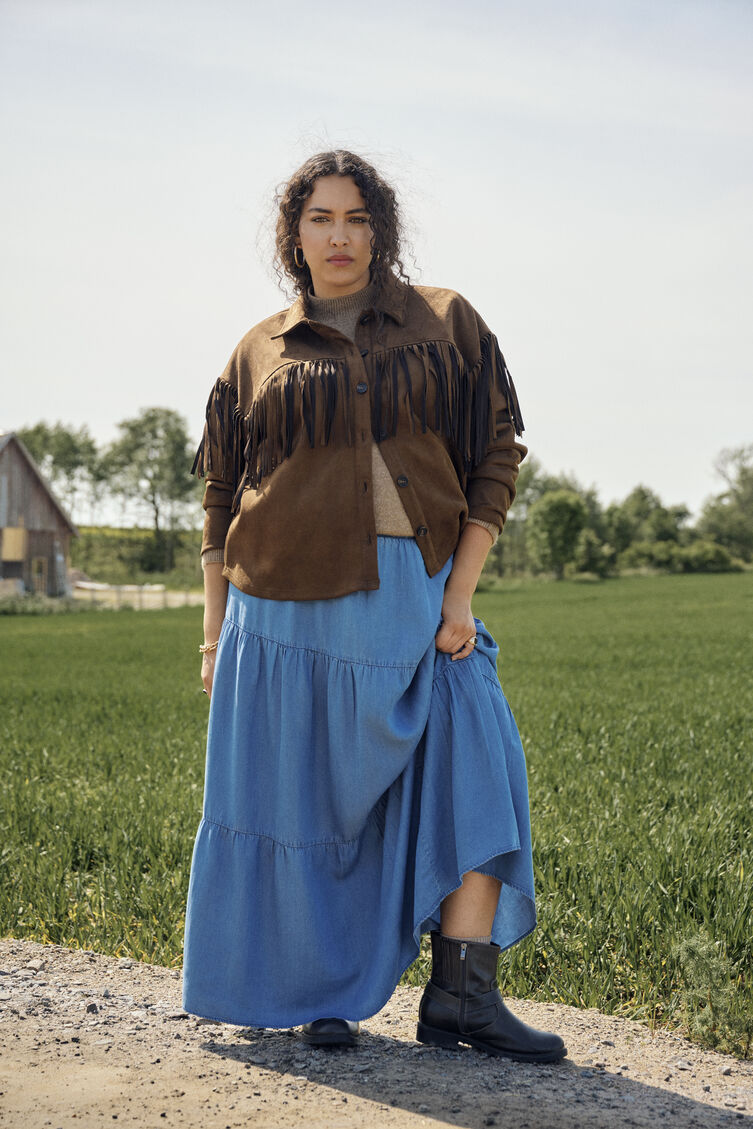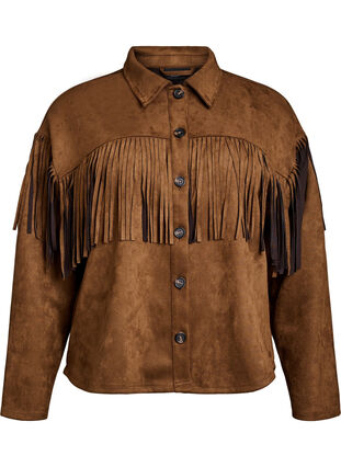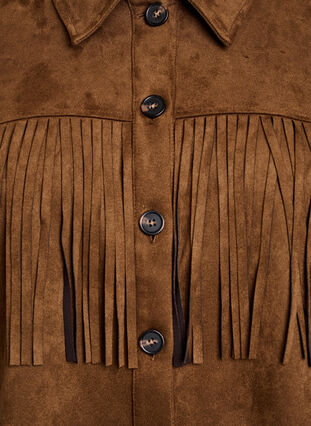 Indoor jacket in soft faux suede with button closure and classic collar. The jacket has long sleeves, a regular fit and is designed with fringes across the chest and back, creating a cool western look.