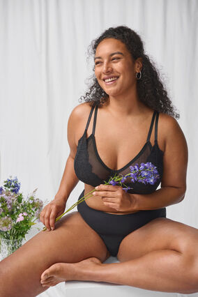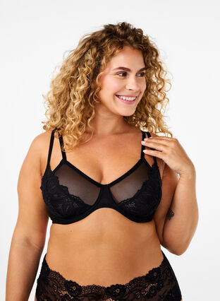 Underwired bra with two separate layers: an inner layer of breathable mesh and an outer layer of elegant lace, where two narrow straps at the front gather into a wide, adjustable shoulder strap at the back.