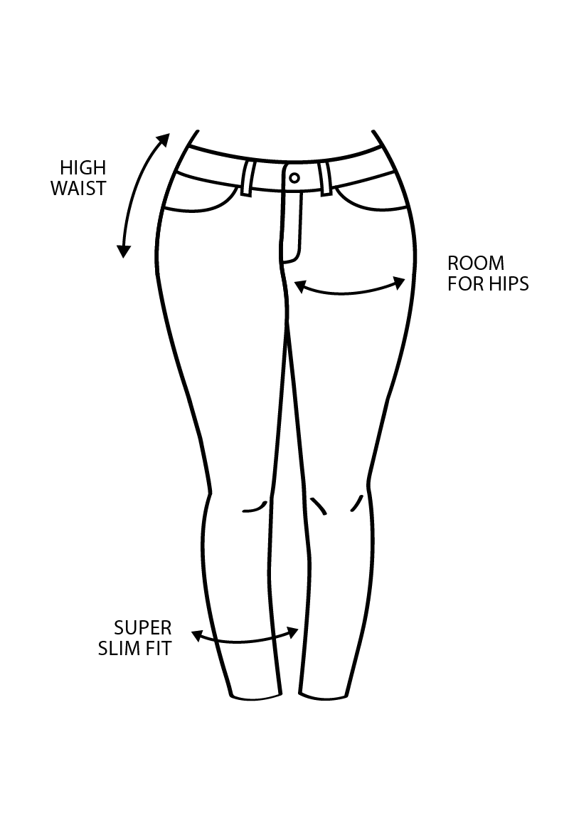 This fit is super snug in the hips, thighs and calves, and narrow in the leg opening. This style is high-waisted and sits above the navel.