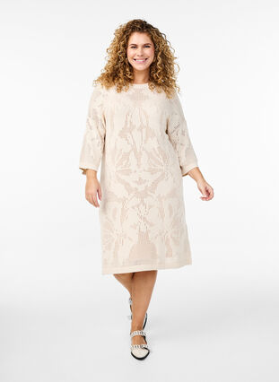 Knee-length knitted dress in a soft cotton blend with an openwork floral pattern, creating a feminine and airy look. The dress features a round neckline, 3/4 sleeves, and a regular fit with side slits.