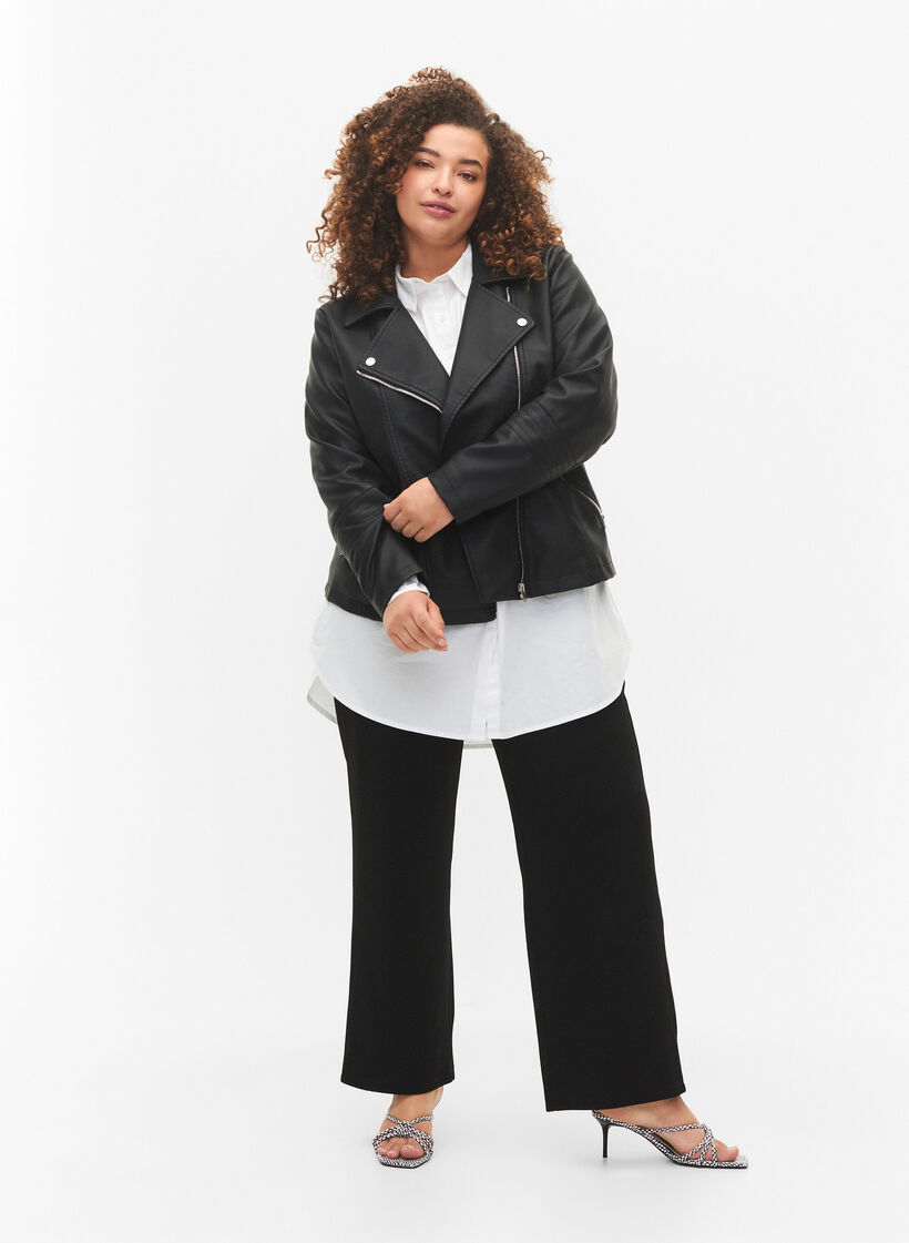 Simple loose-fitting trousers with pockets on the side and an elastic waist.