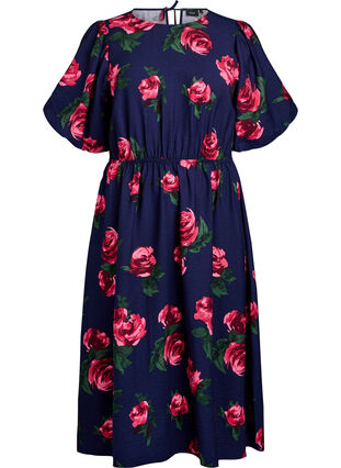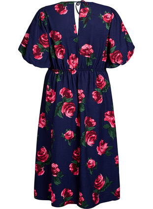 Feminine midi dress with a beautiful rose print, round neckline with an opening and tie at the back of the neck, and short balloon sleeves with inner lining that adds volume. The dress has an elastic waist, creating a feminine silhouette and allowing the gathered skirt to drape beautifully around the body. This dress contains 92% LENZING™ ECOVERO™ viscose fibers, providing natural softness and drape.