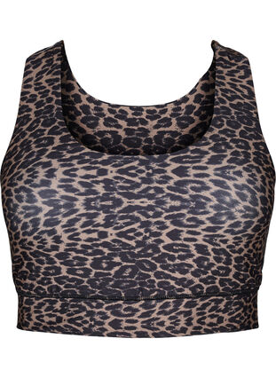 Sports bra with a trendy leopard print, crafted from a stretchy and breathable material that ensures optimal comfort during exercise. The bra is designed with a racerback and wide elastic band under the bust for medium support, which also helps to prevent the bra from riding up.