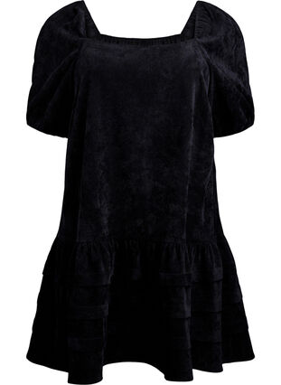 Short dress in soft and comfortable corduroy with elbow-length sleeves featuring elastic cuffs that create a slight puff effect. The dress has a square neckline with elastic trim and a loose, A-line silhouette that gives a feminine and gentle drape. Decorative ruffle layers add extra movement to the dress.