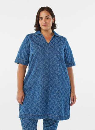 Short denim dress in 100% cotton with a tonal textured pattern and a washed, slightly distressed effect. The dress has a classic collar, handy pockets, a V-neck and short sleeves with wide cuffs. The style has a relaxed fit.