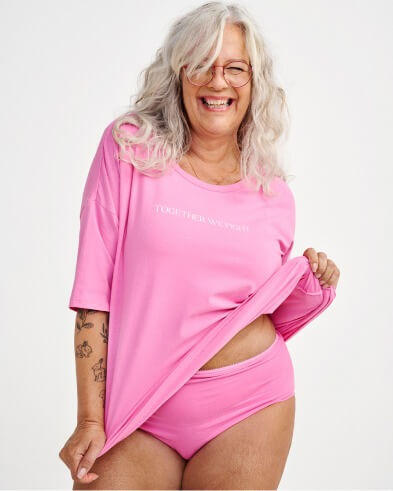 At Zizzi we support breasts – in all of their shapes, colours and sizes. No matter whose they are. That's why we donate money to the Danish organisation against breast cancer every time you buy an item from our collection, which is designed especially for this cause. This way, you too can help support the fight against breast cancer. This year you will find a selection of underwear and t-shirts that you can buy on our website from the 22nd of September.
